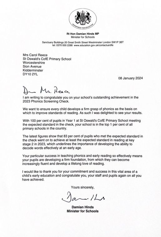 Please see the letter that school received on Friday 19th January, 2024 from the Rt Hon Damian Hinds MP, Minister for Schools. It is a letter of congratulations for our outstanding phonics scores (100% pass rate) by our Year 1 pupils in June 2023 putting us in 'the top 1% of all primary schools in the country'.